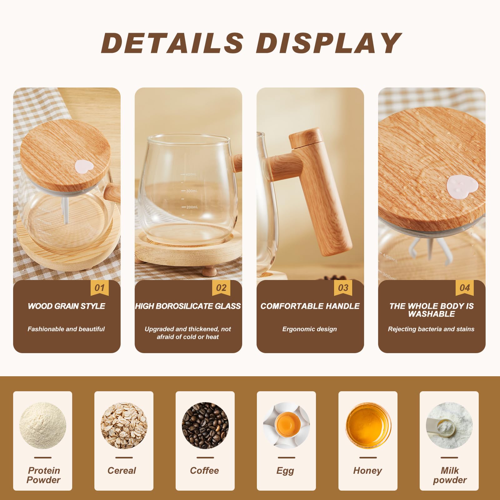 The self mixing glass mug features a transparent color, letting you view your drink swirl around in the mug, heightening the experience, you can enjoy your various beverages prepared in this stylish glass.