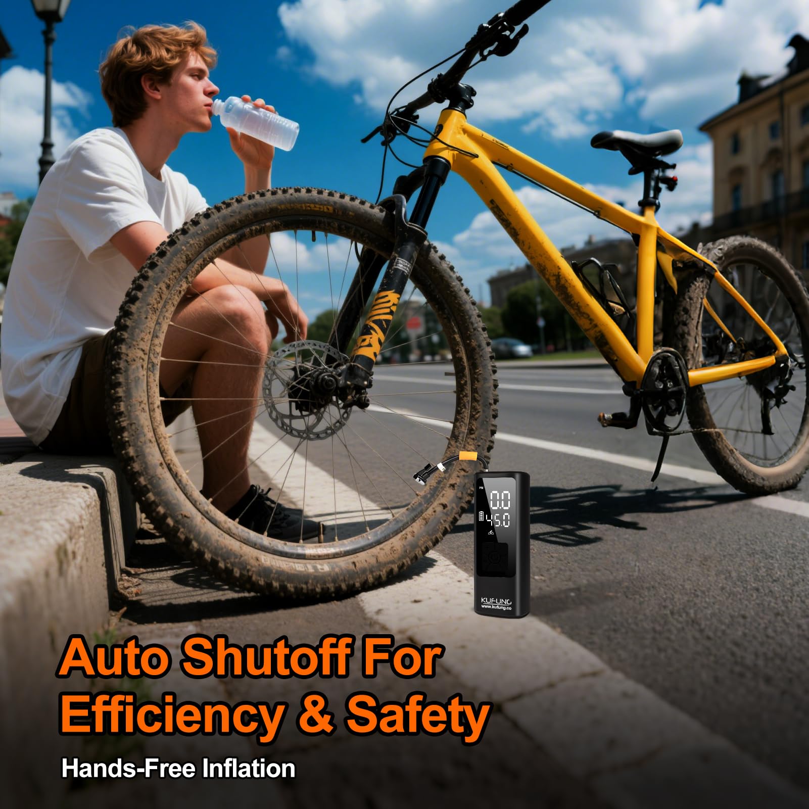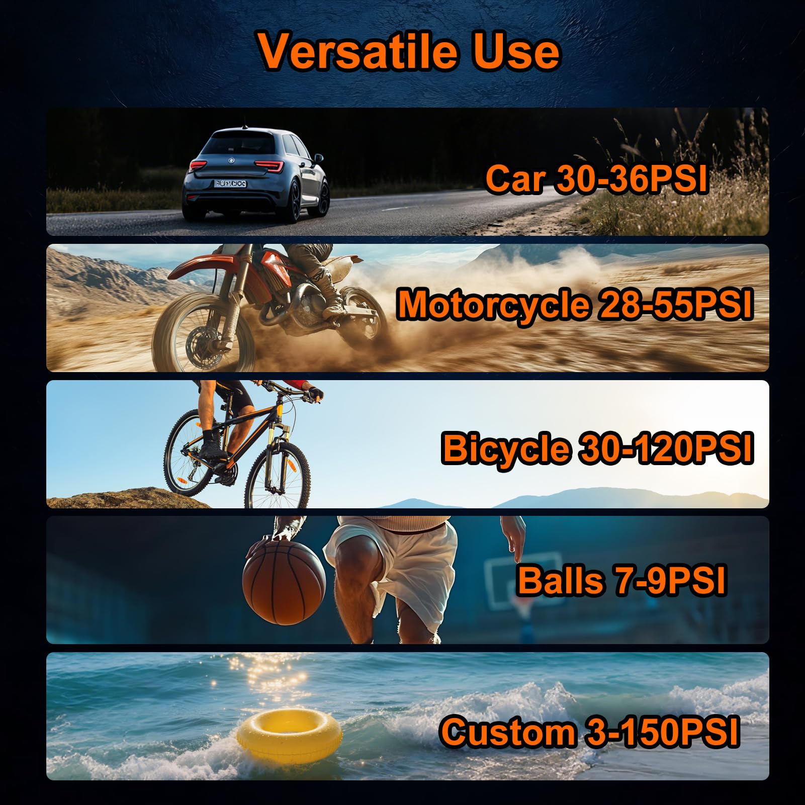 - Efficient & Fast: Our portable air compressor quickly inflates bike, motorcycle, car, and ball tires, automatically shutting off at the desired pressure. With a powerful motor and high-performance chip, it reaches a maximum of 150PSI with rapid airflow. Inflate a car tire (215/45R17) from 30 to 36PSI in under 8 minutes, a T125/80D15 car tire from 0 to 36PSI in less than 4 minutes, and a bike tire from 0 to 120PSI in under 2 minutes. 3X faster inflation than competitors.